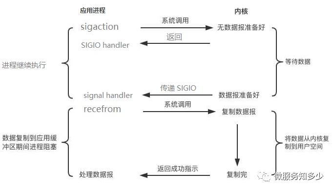信号驱动IO与BIO和NIO最大的区别就在于,在IO执行的数据准备阶段,不会阻塞用户进程。如下图所示:当用户进程需要等待数据的时候,会向内核发送一个信号,告诉内核我要什么数据,然后用户进程就继续做别的事情去了,而当内核中的数据准备好之后,内核立马发给用户进程一个信号,说”数据准备好了,快来查收“,用户进程收到信号之后,立马调用recvfrom,去查收数据。