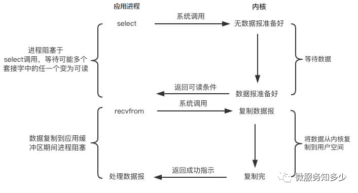 Select是内核提供的系统调用,它支持一次查询多个系统调用的可用状态,当任意一个结果状态可用时就会返回,用户进程再发起一次系统调用进行数据读取。换句话说,就是NIO中N次的系统调用,借助Select,只需要发起一次系统调用就够了。其IO流程如下所示: