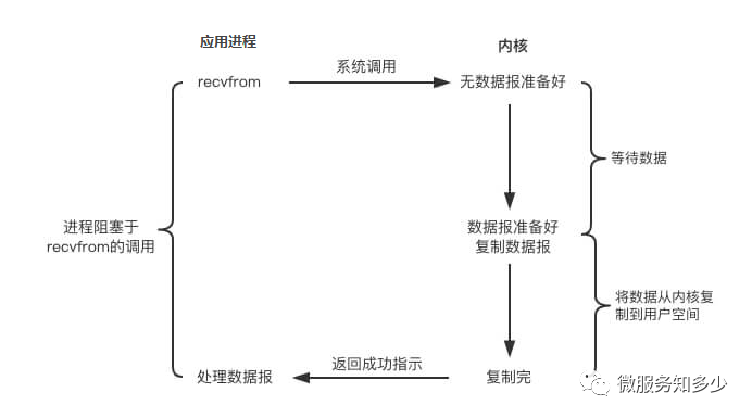从上图可知当用户进程发起IO系统调用后,内核从准备数据到拷贝数据到用户空间的两个阶段期间用户调用线程选择阻塞等待数据返回。