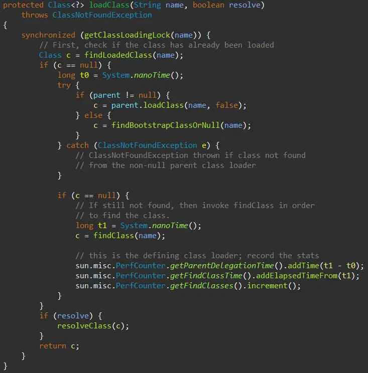 - 如果没有找到指定的类,那么调用当前类加载器的findClass方法来完成类加载。默认的findclass直接抛出ClassNotFound异常,所以我们自定义类加载器要覆盖这个方法。 可以猜测:ApplicationClassLoader的findClass是去classpath下去加载,ExtentionClassLoader是去java_home/lib/ext目录下去加载,实际上就是findClass方法不一样罢了。