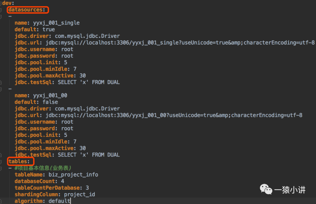 import org.apache.commons.collections4.MapUtils;import org.yaml.snakeyaml.Yaml;import java.io.File;import java.io.FileReader;import java.io.IOException;import java.util.ArrayList;import java.util.LinkedHashMap;import java.util.Map;/** * @author 一猿小讲 */public class ShardingJdbcDataSource { private static LinkedHashMap<String, Object> profile; @SuppressWarnings("unchecked") public static ArrayList<LinkedHashMap<String, Object>> parse(String profileId, String key) throws IOException { //如果profile为空的情况才进行加载配置文件,减少读取文件的次数 if (MapUtils.isEmpty(profile)) { Yaml yaml = new Yaml(); File file = new File(ShardingJdbcDataSource.class.getResource("/").getPath() + "sharding-jdbc.yaml"); try (FileReader fileReader = new FileReader(file);) { Map<String, Object> result = yaml.loadAs(fileReader, Map.class); profile = (LinkedHashMap<String, Object>) result.get(profileId); } } return (ArrayList<LinkedHashMap<String, Object>>) profile.get(key); } public static void main(String[] args) throws IOException { // 开发环境 String profileId = "dev"; // 数据源集合 ArrayList<LinkedHashMap<String, Object>> datasources = parse(profileId, "datasources"); for (LinkedHashMap<String, Object> datasource : datasources) { System.out.println(String.format("数据库名称:%s",datasource.get("name"))); System.out.println(String.format("数据库URL:%s",datasource.get("jdbc.url"))); } System.out.println("=============华丽的分割线=============="); // 表集合 ArrayList<LinkedHashMap<String, Object>> tables = parse(profileId, "tables"); for (LinkedHashMap<String, Object> table : tables) { System.out.println(String.format("表名称:%s",table.get("tableName"))); System.out.println(String.format("数据库拆分 %d 个",table.get("databaseCount"))); System.out.println(String.format("每个数据库表的数目:%s",table.get("tableCountPerDatabase"))); } }}