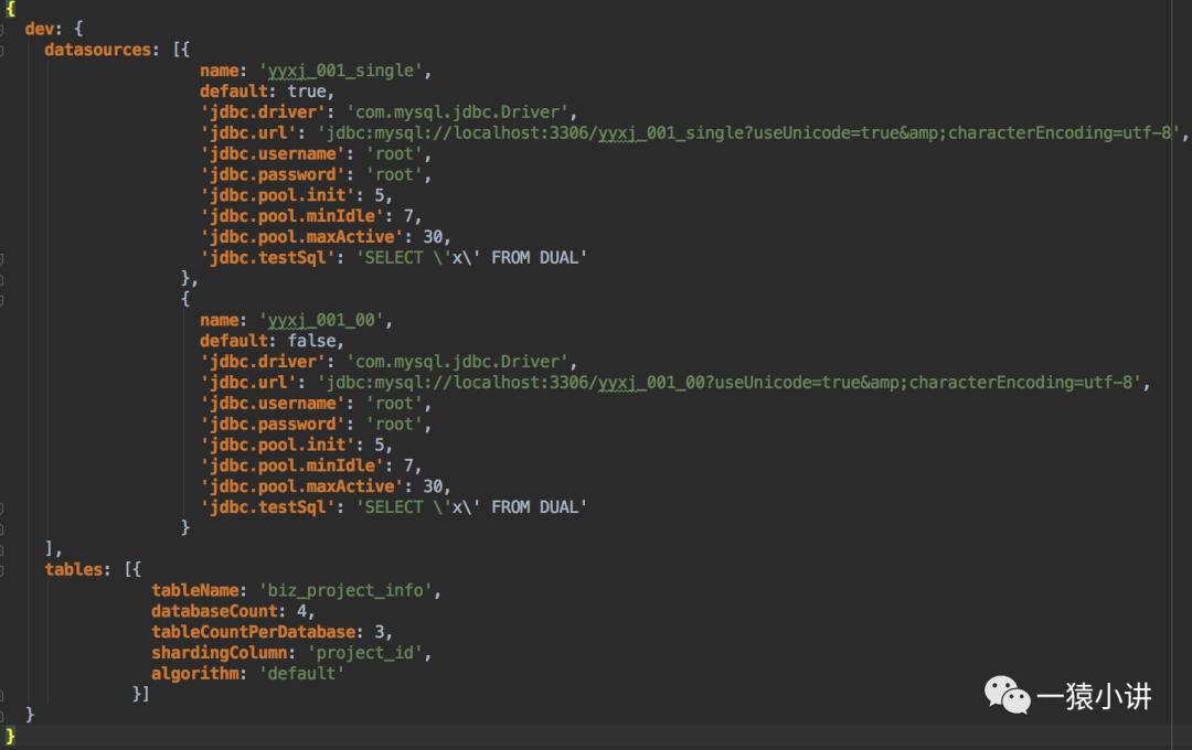 dev 是一个对象,对应于 Java 中的 Map,包含 datasources 和 tables 两个属性。 其本身含义是开发环境配置,当然实际项目中也会有测试、准生产、生产的对应的配置。