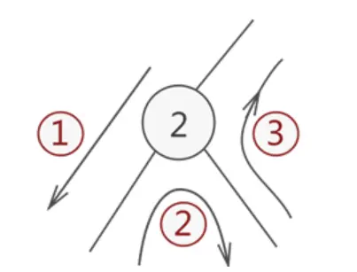 在普通遍历方式中,整个遍历二叉树的过程中,每个节点都被经过了 3 次(虽然叶子节点看似只经过了 2 次,但实际上可以看做是 3 次)。以节点 2 为例,它被经过了 3 次。