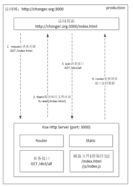 浏览器在最终发起请求的时候,会加上当前的访问域,补全请求地址为:http://chonger.org:3000/dict/all