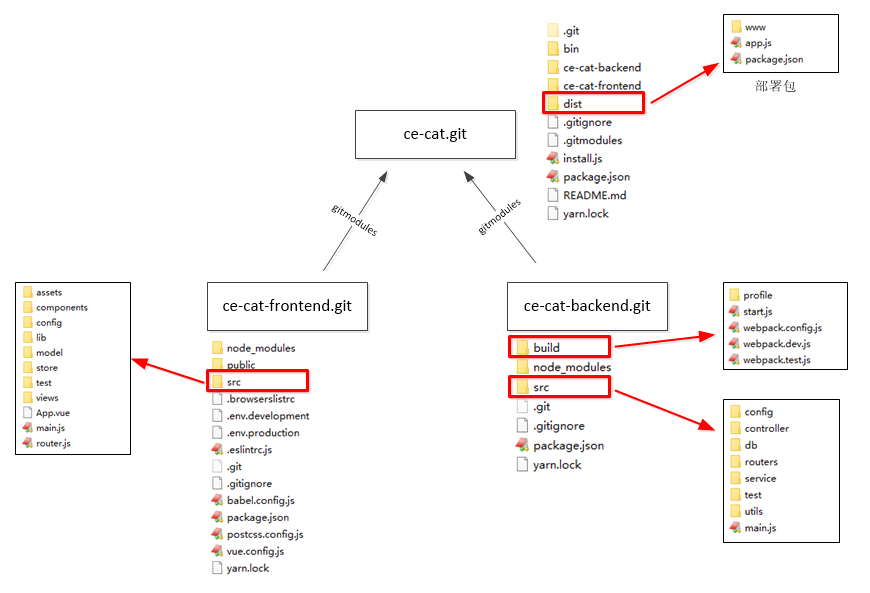 在项目的结构上,虽然都是基于nodejs,又由于是前后端分离开发,为了项目的整洁且互不干涉,也可以由前后端人员分别独立开发,所以就简单的拆分为两个项目。考虑到需要统一的编译构建,所以再添加一个主项目,负责管理构建子项目,生成可以直接交付的部署包。