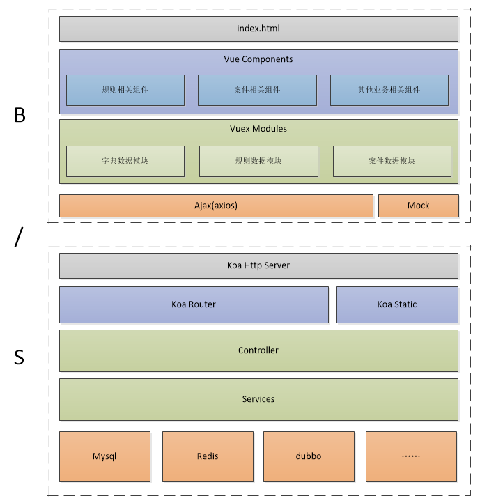 由于是B/S的方式,前端考虑使用Vue ,所以页面相关的事儿都交由浏览器完成,这样前端项目的交付物就是一堆静态的资源文件,这也完全符合当前基于vue-cli 开发的结果物。