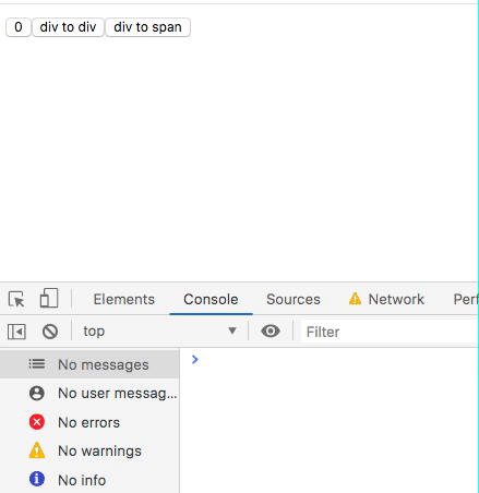 在这里,我们不妨用Reactv15.0.0写个demo,来验证一下这个结论。这个demo分别演示把Counter的父组件从“div切换到div”,“div切换到span”的结果。我录了个小视频: