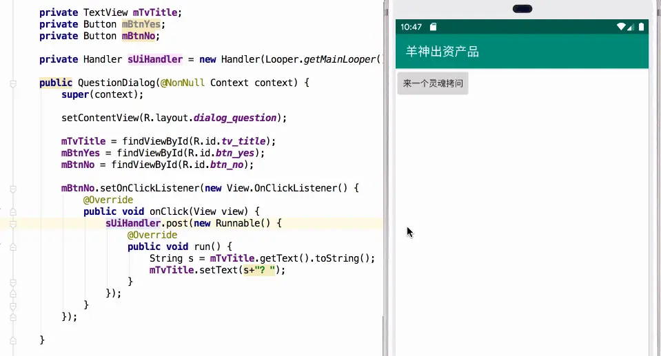 很简单吧,点击按钮,新启动一个线程去模拟网络请求,结果拿到后,把问题展示在Dialog。