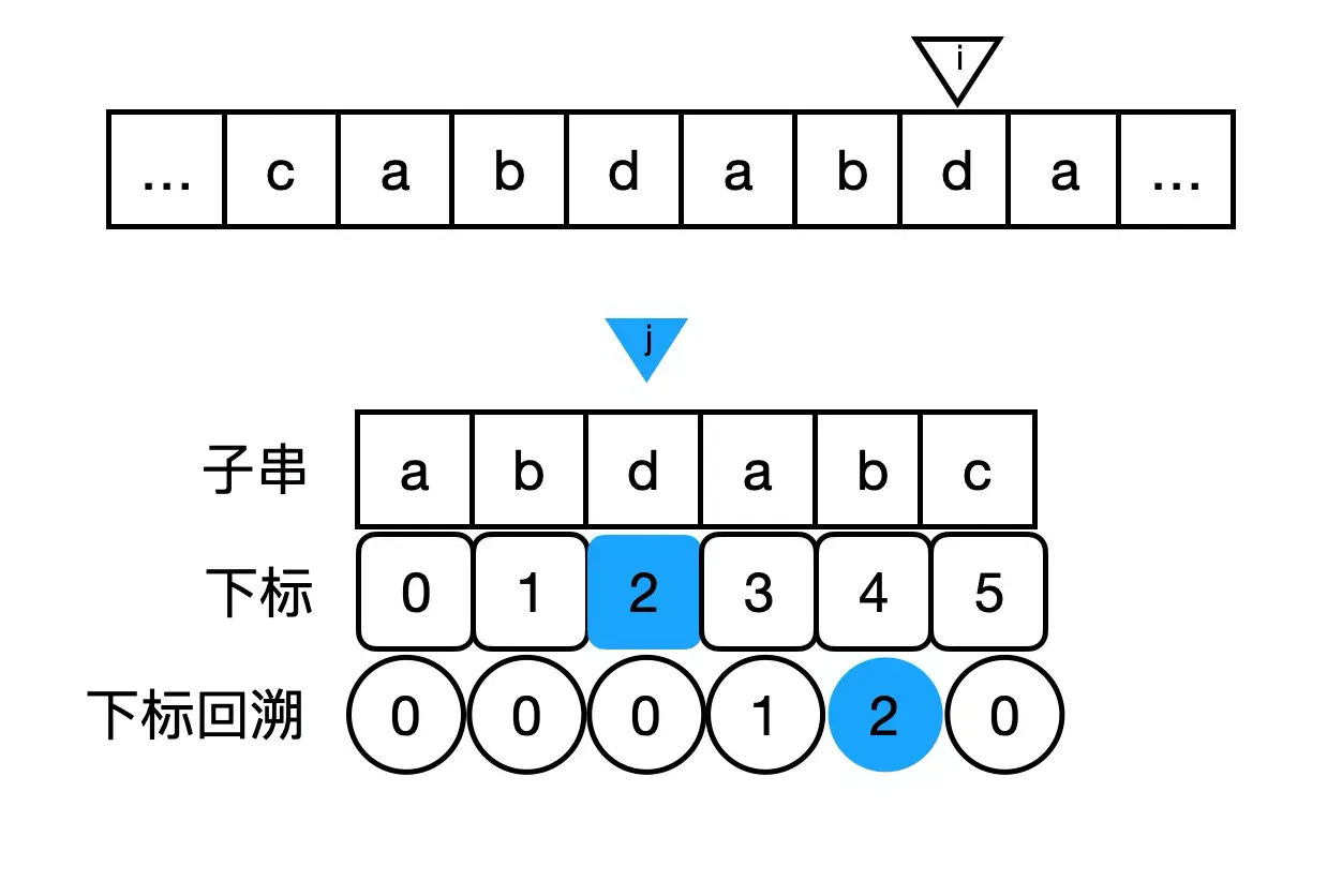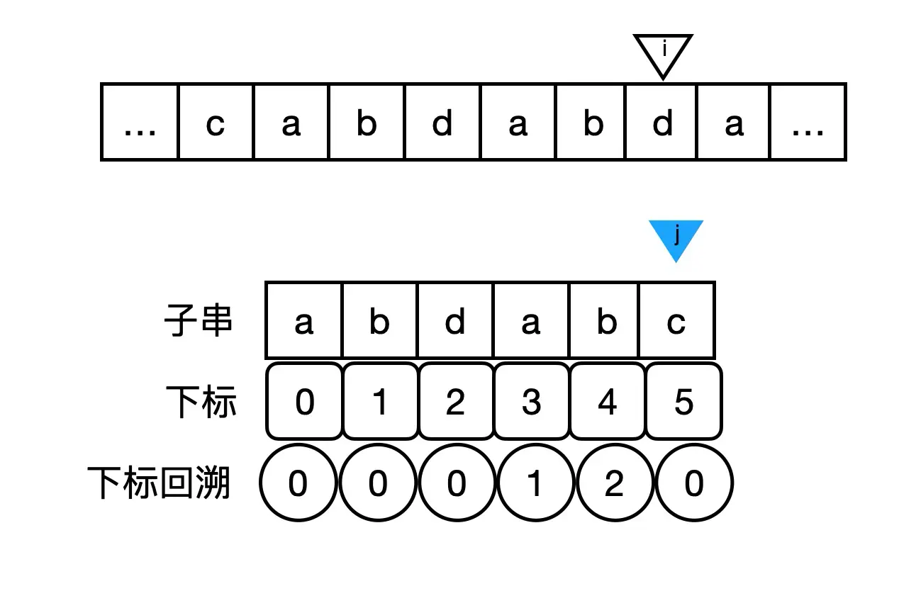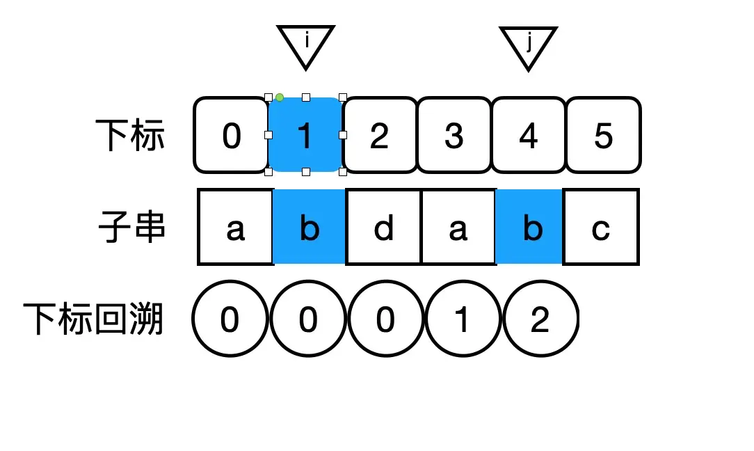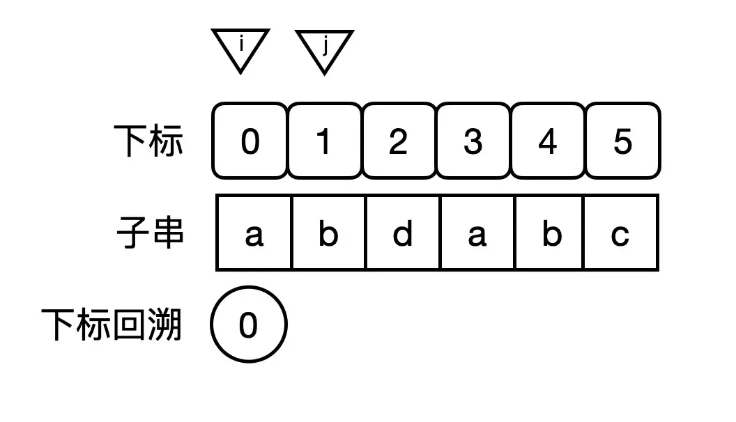 - 字符不相等了,i向前移动找前一个字符,如果找到了=0,说明前面没有重复的字符,就给j的回溯下标设为0
