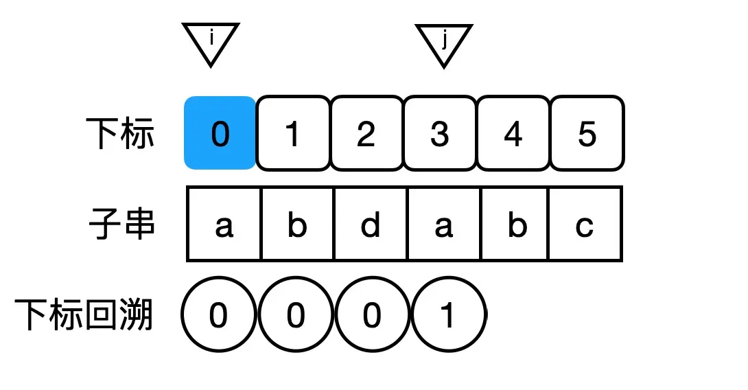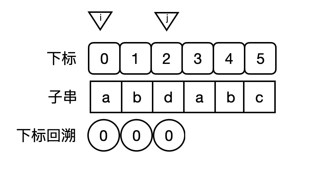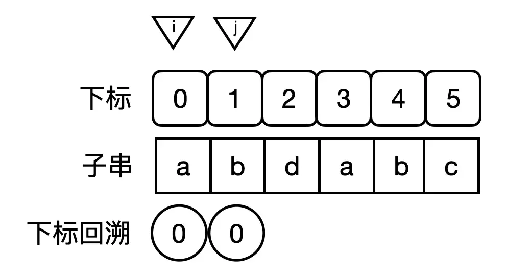 - string[i]与string[j]不相等,而且i==0,那么string[b]的回溯下标也是0