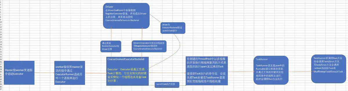DAGScheduler划分好stage,并将生成的TaskSet提交给TaskScheduler,TaskScheduler向Driver请求分配资源,Driver将可用的ExecutorBackend资源发给TaskScheduler,在TaskScheduler中将Task分配给ExecutorBackend,最后向ExecutorBackend发送launchTask请求,在ExecutorBackend中调executor对象的launchTask,在Executor对象的launchTask方法中启动TaskRunner线程并用线程池去执行TaskRunner线程;