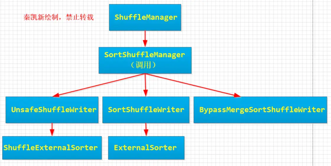 - ShuffeManager:目前只有一个实现 SortShuffleManager。SortShuffleManager依赖于ShuffleWriter提供服务,通过ShuffleWriter定义的规范,可以将MapTask的任务中间结果按照约束的规范持久化到磁盘。SortShuffleManager总共有三个子类, UnsafeShuffleWriter,SortShuffleWriter ,BypassMergeSortShuffleWriter用于Shuffle的写。 SortShuffleManager使用BlockStoreShuffleReader用于Shuffle的读。SortShuffleManager依赖于ShuffleHandle样例类,主要还是负责向Task传递Shuffle信息。一个是序列化,一个是确定何时绕开合并和排序的Shuffle路径。