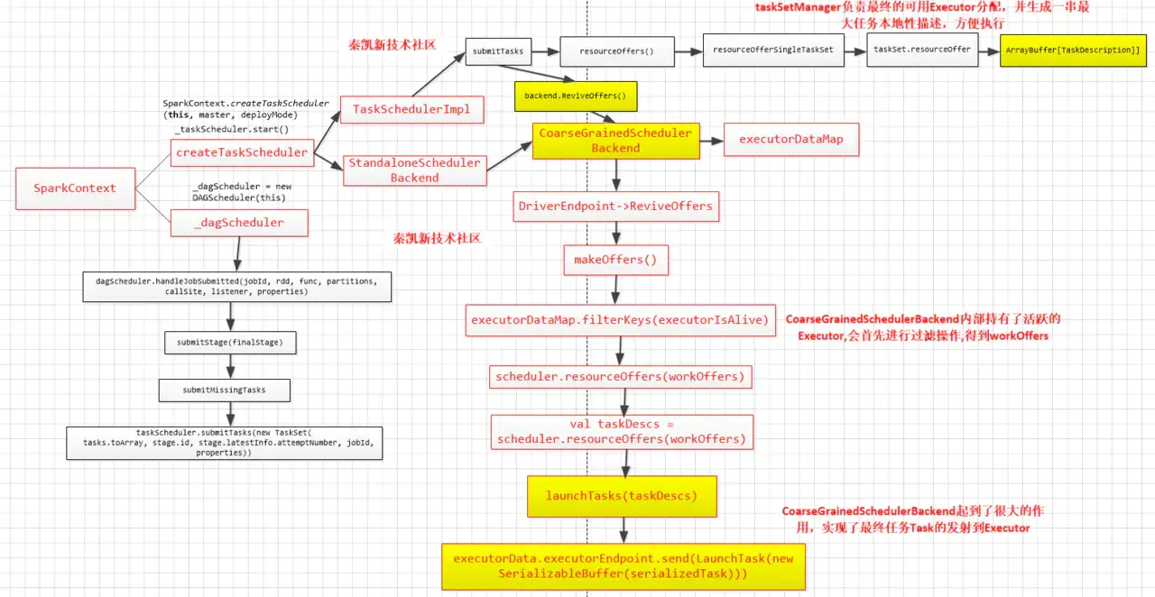 org.apache.spark.scheduler.DAGScheduler#submitMissingTasks,第12步submitStage方法的最后一步是提交Task,在Stage没有不可用的父Stage时,提交当前Stage中还未提交的Task taskScheduler#submitTasks,DAGScheduler#submitMissingTasks方法会调用该方法提交未计算的TaskSchedulableBuilder#addTaskSetManager,将当前的TaskSetManager提交到调度器的调度池中,TaskScheduler会先把DAGScheduler给过来的TaskSet封装成TaskSetManager扔到任务队列里,然后再从任务队列里按照一定的规则把它们取出来在SchedulerBackend给过来的Executor上运行。关于调度器相关请看Spark 内核的P126-P128org.apache.spark.scheduler.cluster.CoarseGrainedSchedulerBackend#reviveOffers,在15步taskScheduler#submitTasks的最后会调用reviveOffers方法,申请资源。进入CoarseGrainedSchedulerBackend的reviveOffers方法,可以看到在方法里面driverEndpoint向自己发送了一个ReviveOffers消息,而这个driverEndpoint我们前面也讲过,就是当前应用程序的Driver。org.apache.spark.scheduler.cluster.CoarseGrainedSchedulerBackend.DriverEndpoint#receive,通过netty发送一个请求资源的消息后,CoarseGrainedSchedulerBackend的receive方法则会接收17步发送的消息。在该方法中,由于接收到的是ReviveOffers,会调用makeOffers方法开始分配资源。org.apache.spark.scheduler.TaskSchedulerImpl#resourceOffers,为每一个Task具体分配计算资源,输入时ExecutorBackend以及可用的Cores,输出是TaskDescription的二维数组,在其中确定了每个task具体运行在哪个ExecutorBackend;在方法内部先将可用的executors添加到数据结构中,然后在将可用的executors进行shuffle以便做到负载均衡,为每个executor创建一个task数组用于存放TaskDescription,最后遍历调度策略中的TaskSet,使用就近原则为task分配executor,在这里需要强调一点的是DAGScheduler.submitMissingTasks()方法中我们是获取了每个task的对应数据的位置,而在本方法中的taskSet.myLocalityLevels是为了获取Task对应数据位置的级别TaskSchedulerImpl#resourceOfferSingleTaskSet,接着进入resourceOfferSingleTaskSet方法,遍历所有的executor的索引地址,以便作为tasks的索引,将每个task分配给相应的executor,并填充tasks;TaskSetManager#resourceOffer,为taskSet中的task分配executor,并将信息存储在tasks中- 再到DriverEndPoint的makeOffers方法中,scheduler.resourceOffers(workOffers)已经执行完毕,taskSet已经分配完毕,接着执行