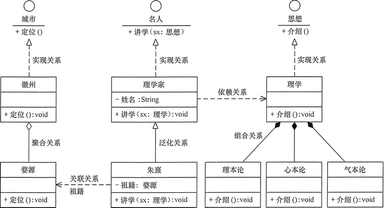 (2)分析以上实例,找到相关类并确定它们之间的关系,然后利用 UMLet 画出类以及类之间的关系图,图 5 以对理学家朱熹的介绍为例介绍类图的画法。