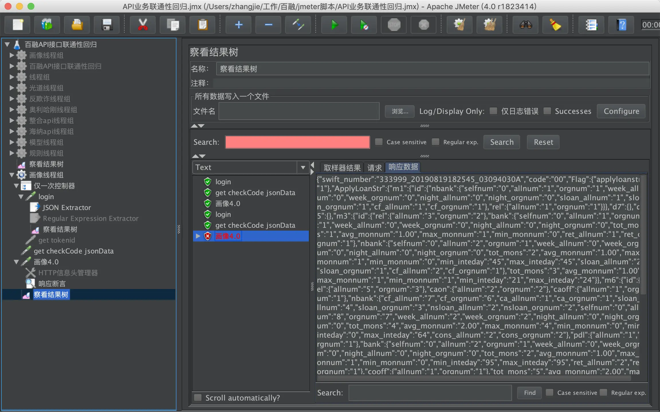 这样,在测试过程中,正确的(不含""applyloanstr":"99")的响应结果在结果树中显示为绿色,错误的(含有""applyloanstr":"99")响应结果显示为红色,十分便于我们观察出错情况,同时,错误的结果也会计入聚合报告的统计之中,可以实时观察错误率。