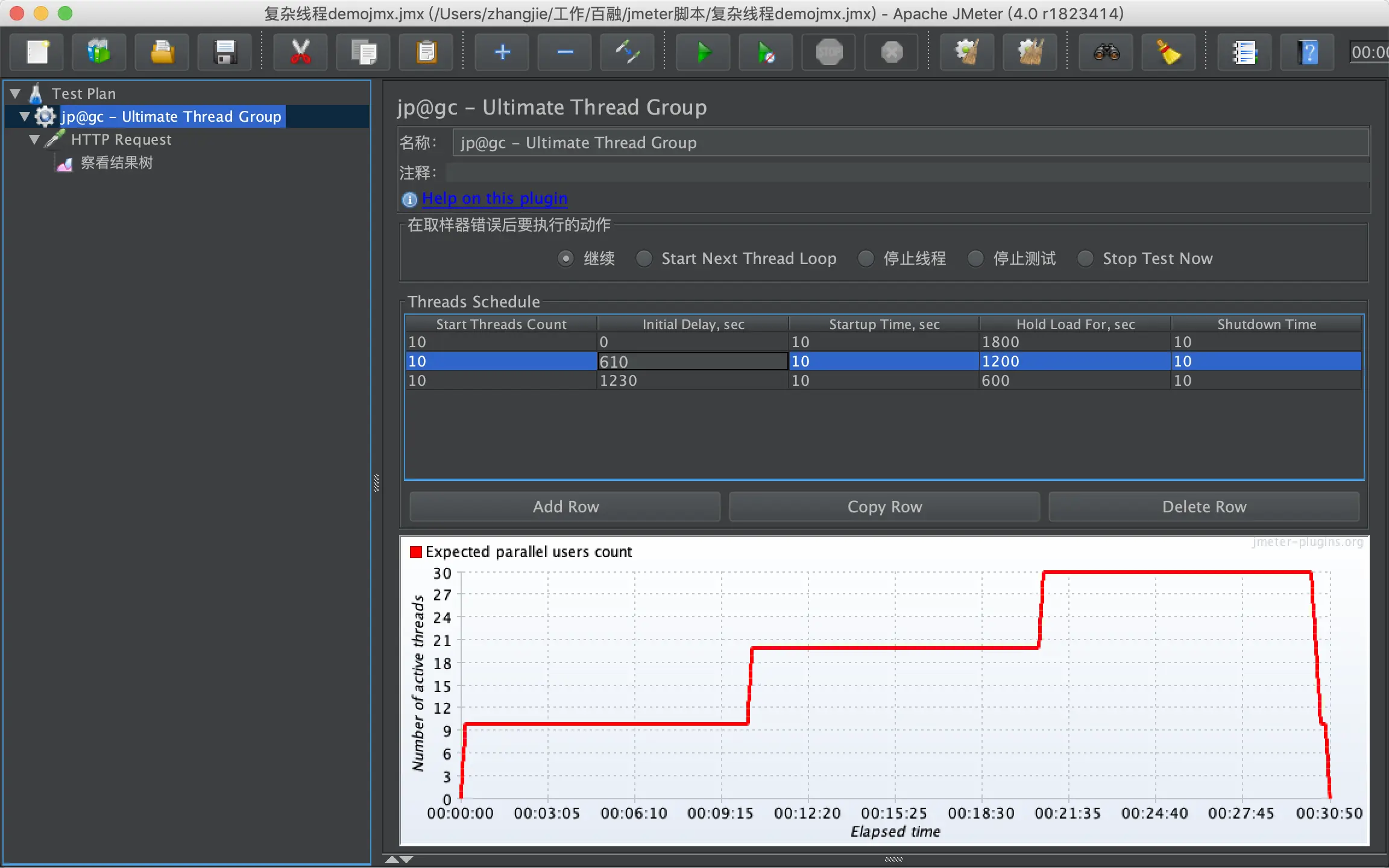 JMeter自带的线程组无法实现复杂的测试场景,只能设定固定线程数,对于类似浪涌式线程无法实现。JMeter Plugins提供了2个支持复杂场景的线程组元件,Ultimate Thread Group和Stepping Thread Group。