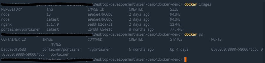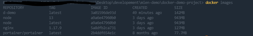 命令执行结束之后,我们使用docker images 查看当前存在的docker image。就能发现我们刚才创建的d-demo:latest了。