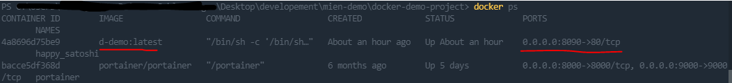 执行命令之后我们就可以使用docker ps来查看当前运行的image