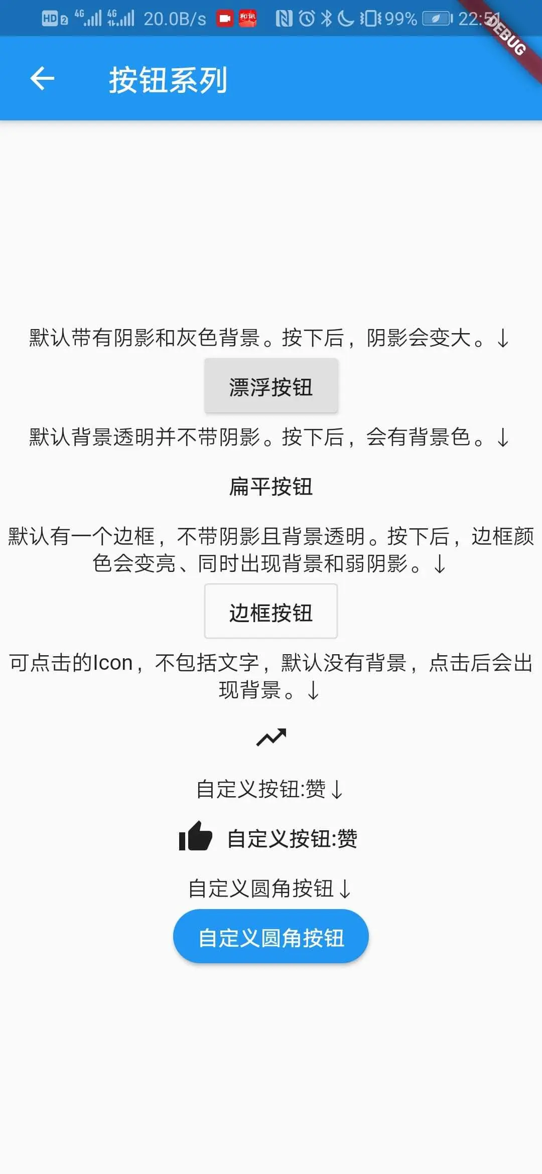 - 按钮系列(RaisedButton/FlatButton/OutlineButton/IconButton/FlatButton.icon/shape)