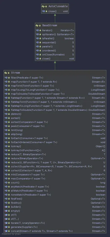 从上面的图中我们可以看到Stream继承自BaseStream。Stream中定义了很多非常实用的方法,比如filter,map,flatmap,forEach,reduce,collect等等。接下来我们将会逐一讲解。