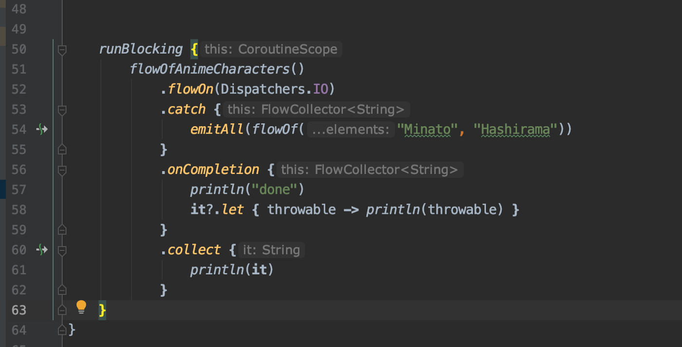 catch {…} 的工作就是捕获 IllegalStateException() 并重新开始新流程,这使我们从源头上留下“ Madara”,“ Kakashi”,在后面留下“ Minato”,“ Hashirama”。 但是 onCompletion {…} 会显示错误吗?