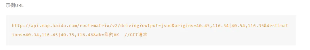 URL=http://api.map.baidu.com/routematrix/v2/交通方式?output=json&origins=起点坐标(先纬度再经度)&destinations=终点坐标&ak=你的AK值。
