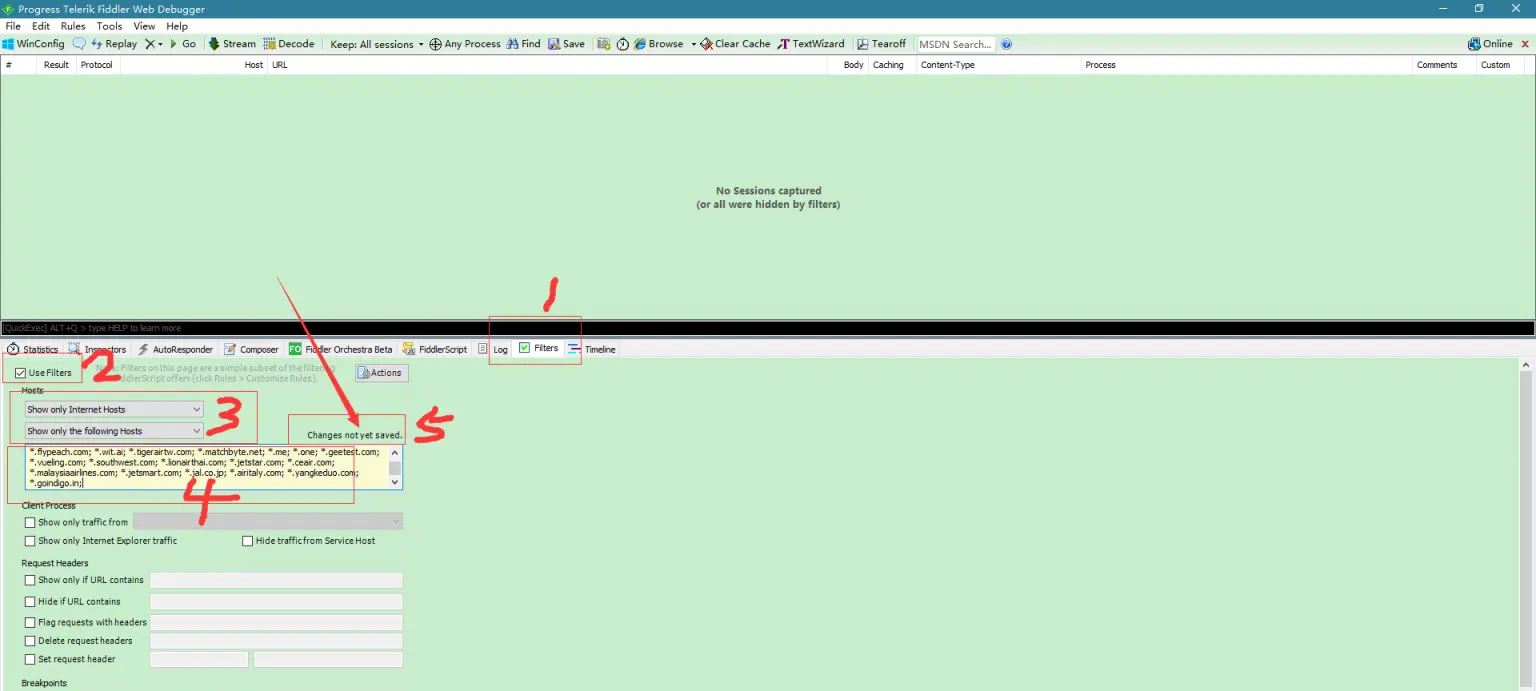 我们打开Fiddler,为了方便我们分析数据,建议大家配置过滤器,仅过滤我们需要的信息,如上图我们将面板切换至Filters项,勾选“Use Filters”旁边的复选框,Hosts选项分别选择:1. Show only Internet Hosts、2. Show only the following Hosts;并在编辑框中输入“