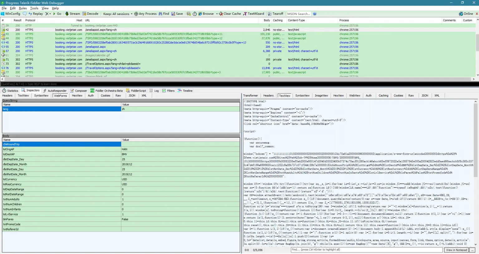 booking.vietjetair.com/ameliapost.… 我们可以通过Fiddler的WebForms面板查看,如果您不知道如何找到该面板,请在Fiddler中切换至Inspectors项,它的子菜单栏中就能看到WebForms选项了,通常查询接口包含始发站点(通常三字码)、到达站点(通常三字码)、日期、货币、人的类型(成人/小孩/婴儿)、与其它必要数据;