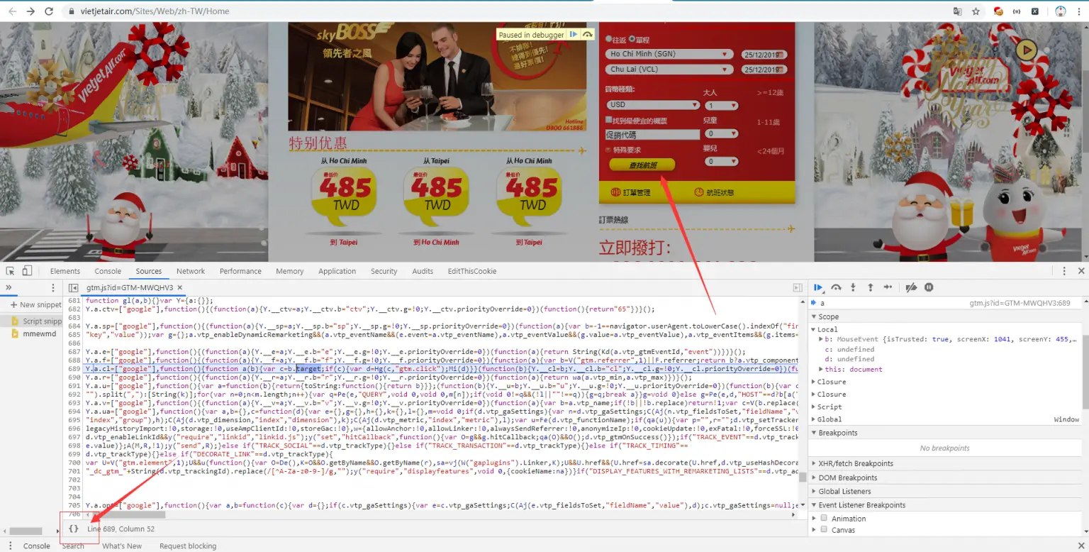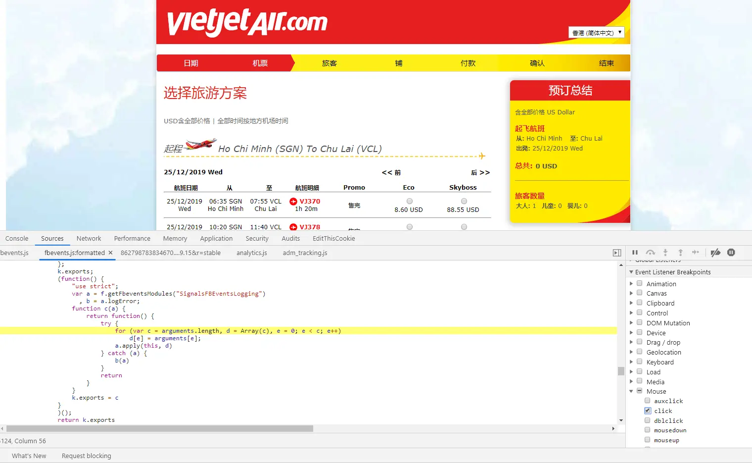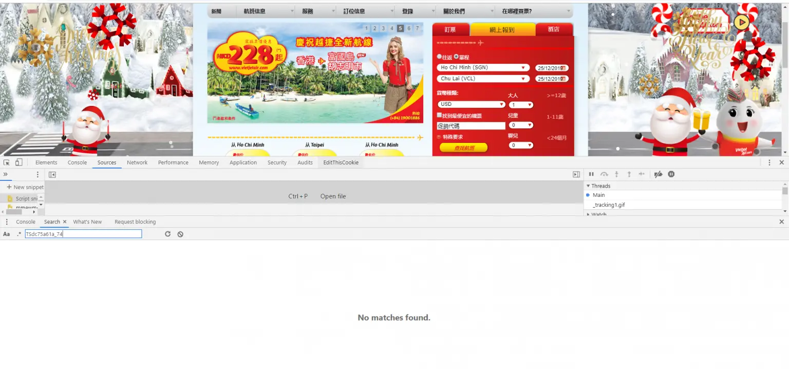回到越捷航空首页,并打开控制台(可按F12唤出),我们再次尝试输入航线,然后点击查找航班,如无意外,网页便会断了下来,然后我们将鼠标移到cookie中,便可清晰的看到,我们要找的加密字段了。