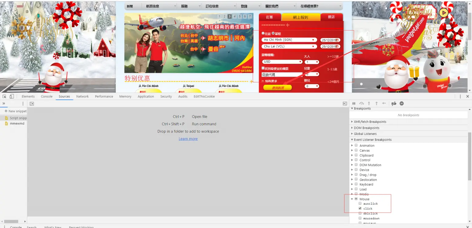 俗话说,山路不通走水路,通过上面的判断,我们知道了Cookie加密的字段名称极有可能是动态生成的,所以我们不能使用该方式,改用Mouse断点法测试一下吧!首先我们打开控制台右侧的“Event Listener Breakpoints”选项,并找到“Mouse”子项,并在“click”旁边的复选框中勾上,用以监听鼠标的点击事件(这实际上就是一个钩子,而这个钩子是Chrome内置的)。
