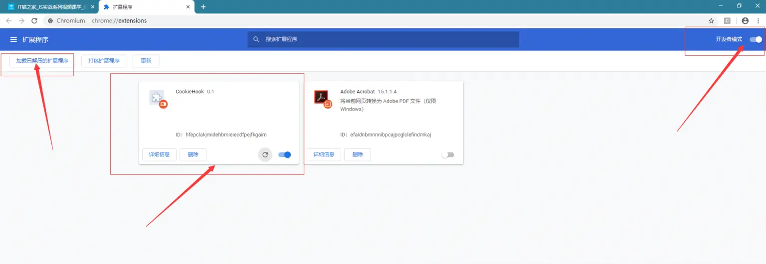 在chrome的url中输入: chrome://extensions/ 然后启用开发者模式,点击加载已解压的扩展程序,选择刚创建的目录(是目录),按确定后将会看到如上图的扩展项。
