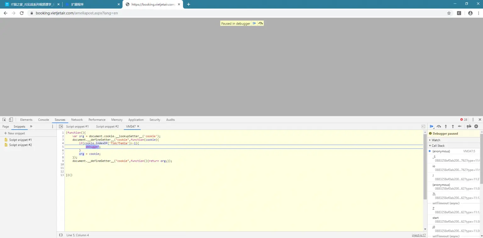 消息中断机制 ,如上述所言,它可以监听一切传送的内容,那么在JS中,它的作用也是类似的,今天我们将会学习如何通过钩子快速定位到Cookie加密协议入口,本期我们就一起来探讨下,在日常爬取数据的过程中,当我们遇到Cookie加密授权时该如何处理,我们将以越捷航空官网作为演示的目标。