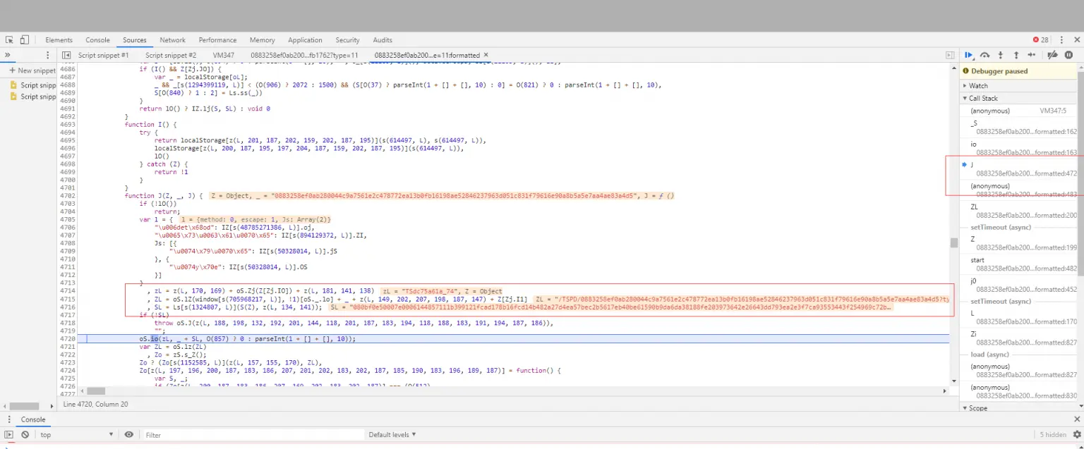 通过在堆栈中寻找源,我们不难发现,它的入口就是:J(Z, _, J)这个函数,当然这个函数是可变的,根据我们分析的规律,它是间隔2小时更新一次算法,(应该说变更一次模板)如果您看到的跟我的不一样,请不用怀疑,它就是加密的入口,我们清晰可见:zL这个变量中得到的是字段名“ TSdc75a61a_74 ”那不就是我们要找的么,从而我们可以证实了这个字段名是动态生成的想法。