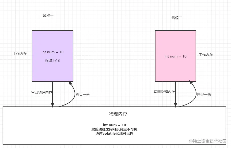 线程在操作变量的时候,首先从物理内存中复制一份到自己的工作内存中(栈内存),更新以后再写入物理内存中