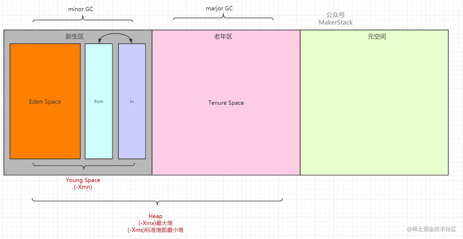 新生区和老年区的大小比例为1:2,通过-XX:NewRatio=n设置新生代和老年代的比例,n代表老年区所占的比例。