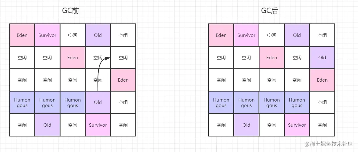 Eden再次满了以后再次触发一次GC,没有死亡的对象放置于to区域,然后将from区域中没有死亡的对象全部置于to区域,年龄+1。之后每一次GC都会出发一次from和to的交换,哪个区域是空的那个区域就是to - 当