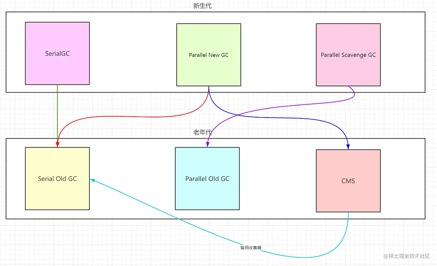 | UseConcMarkSweepGC | Parallel New GC | 复制算法 | CMS和Serial Old GC | 标清 |