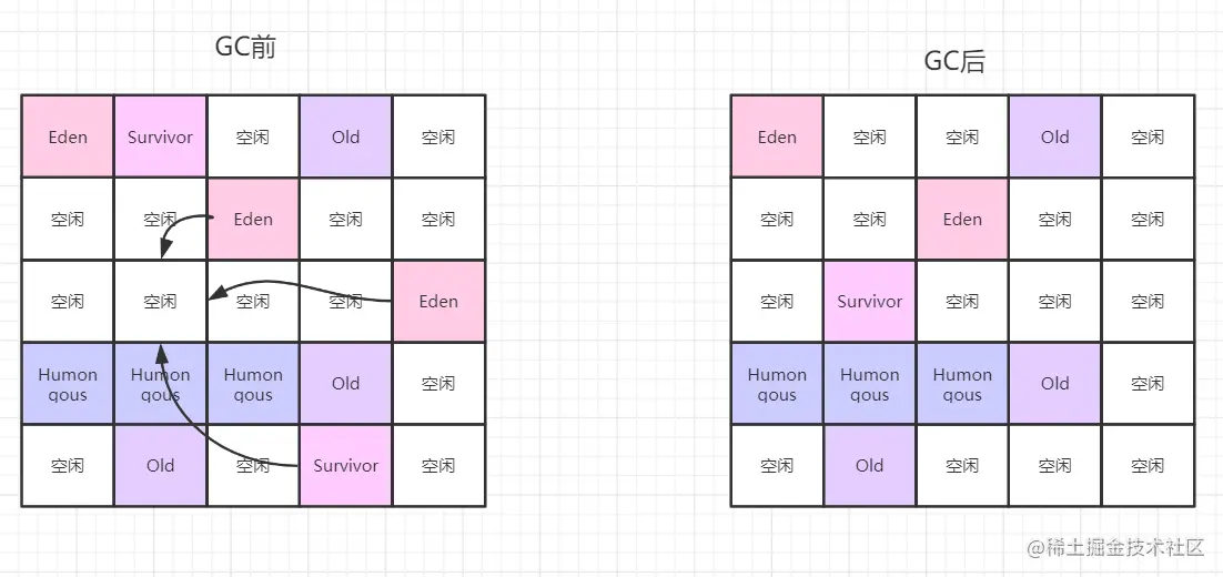 在进行垃圾回收的时候直接对一个region进行回收,保存下来的对象通过复制算法复制到TO区或者Old区。