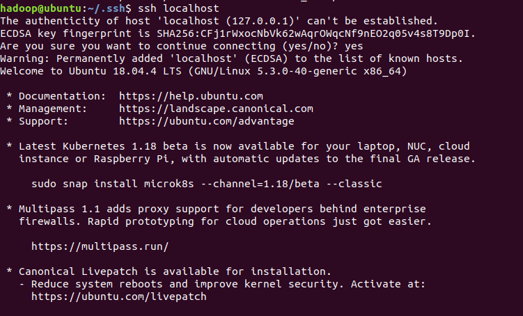 完成后,直接键入“ssh localhost”,能无密码登录即可,