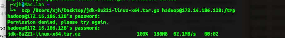 scp /Users/xjh/Desktop/jdk-8u221-linux-x64.tar.gz hadoop@172.16.186.128:/tmp