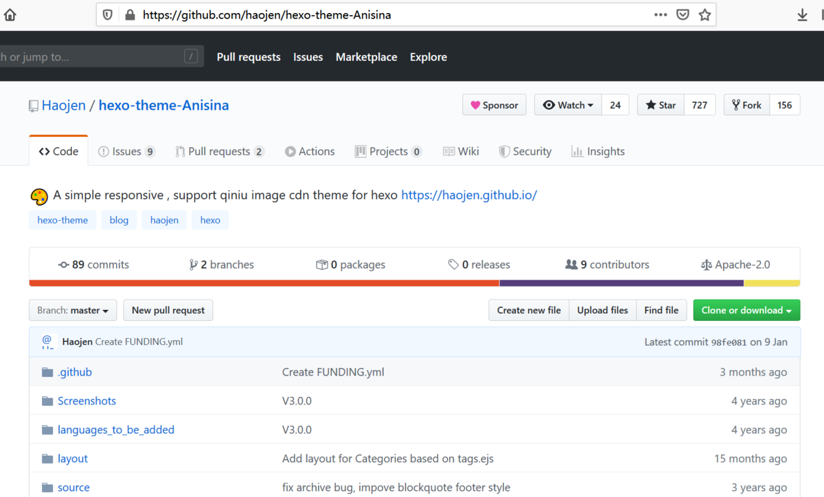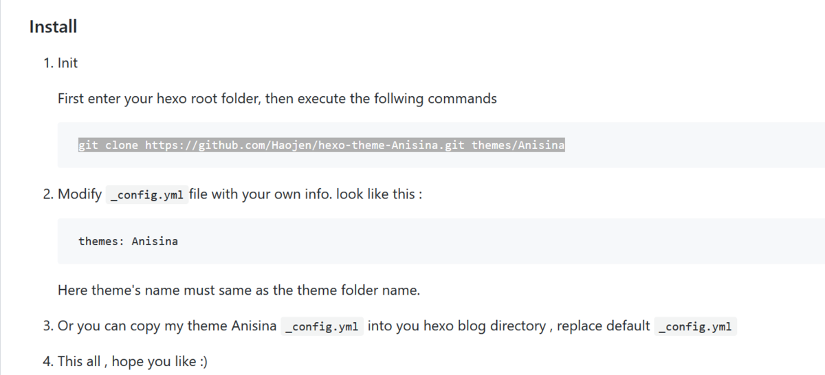 主题这一块可以选择自己喜欢的,以下是以一个Anisina主题为例,这里有很多主题可以选择:传送门:hexo.io/themes/。比如选一个主题:github.com/haojen/hexo…,打开链接,进入到GitHub里面,有详细的安装教程。