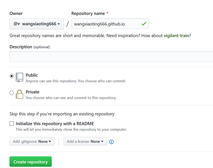 创建一个和你用户名相同的仓库,后面加.http://github.io后缀,必须要同名哦,不然后面会出现页面404的情况,点击create respository按钮创建。