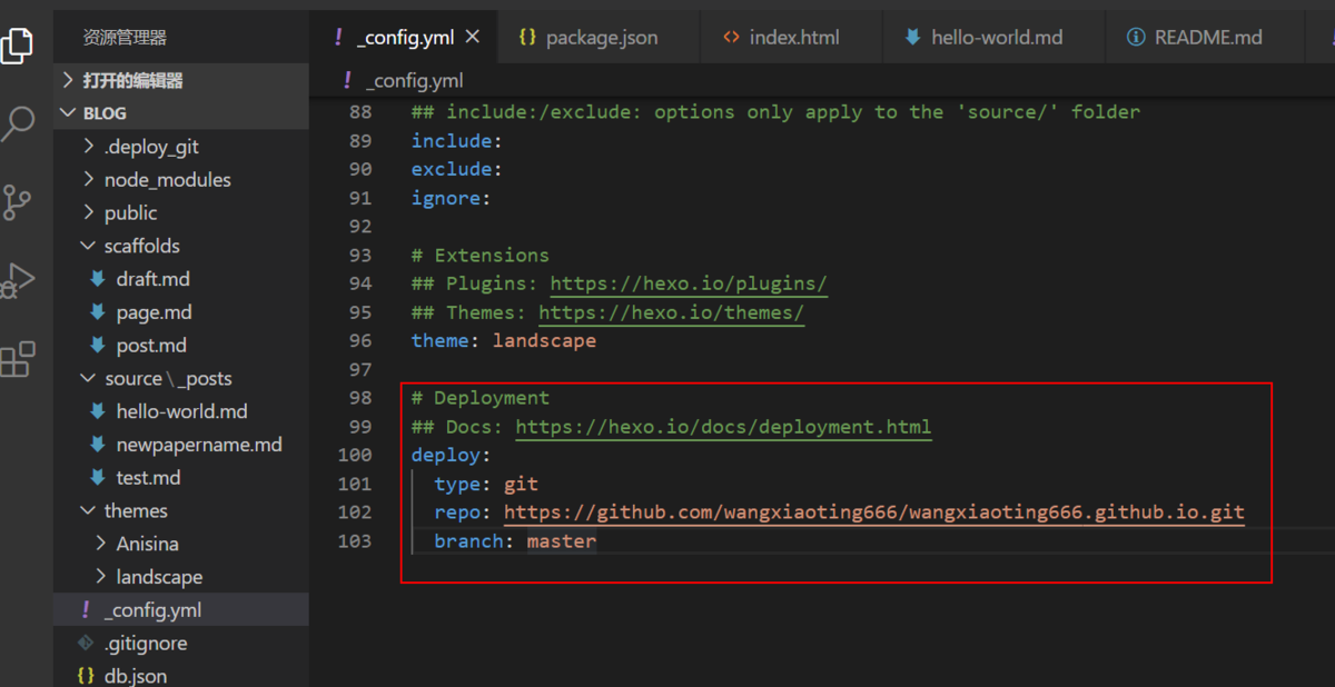 在项目里面找到 _congif.yml文件,找到 deploy 字段,把以下代码放进去,填写第一步新建的仓库地址。