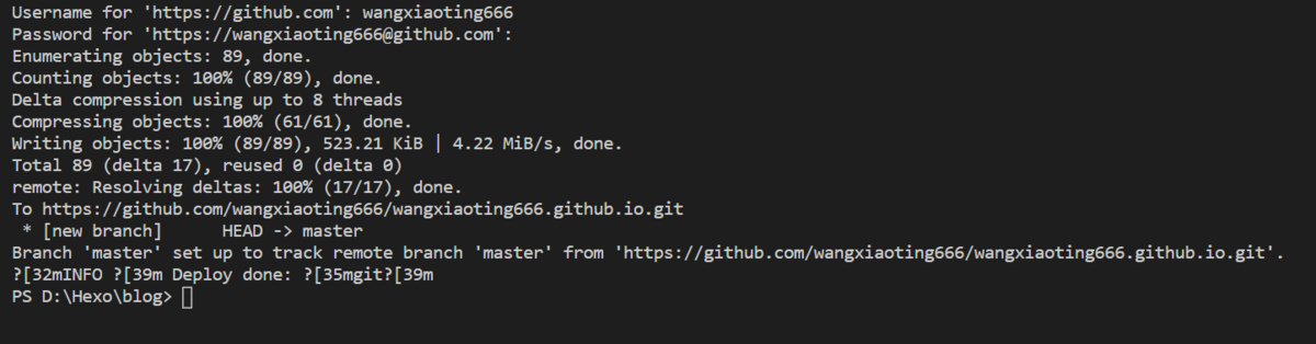 hexo deploy注意这里需要输入GitHub用户名和密码哦