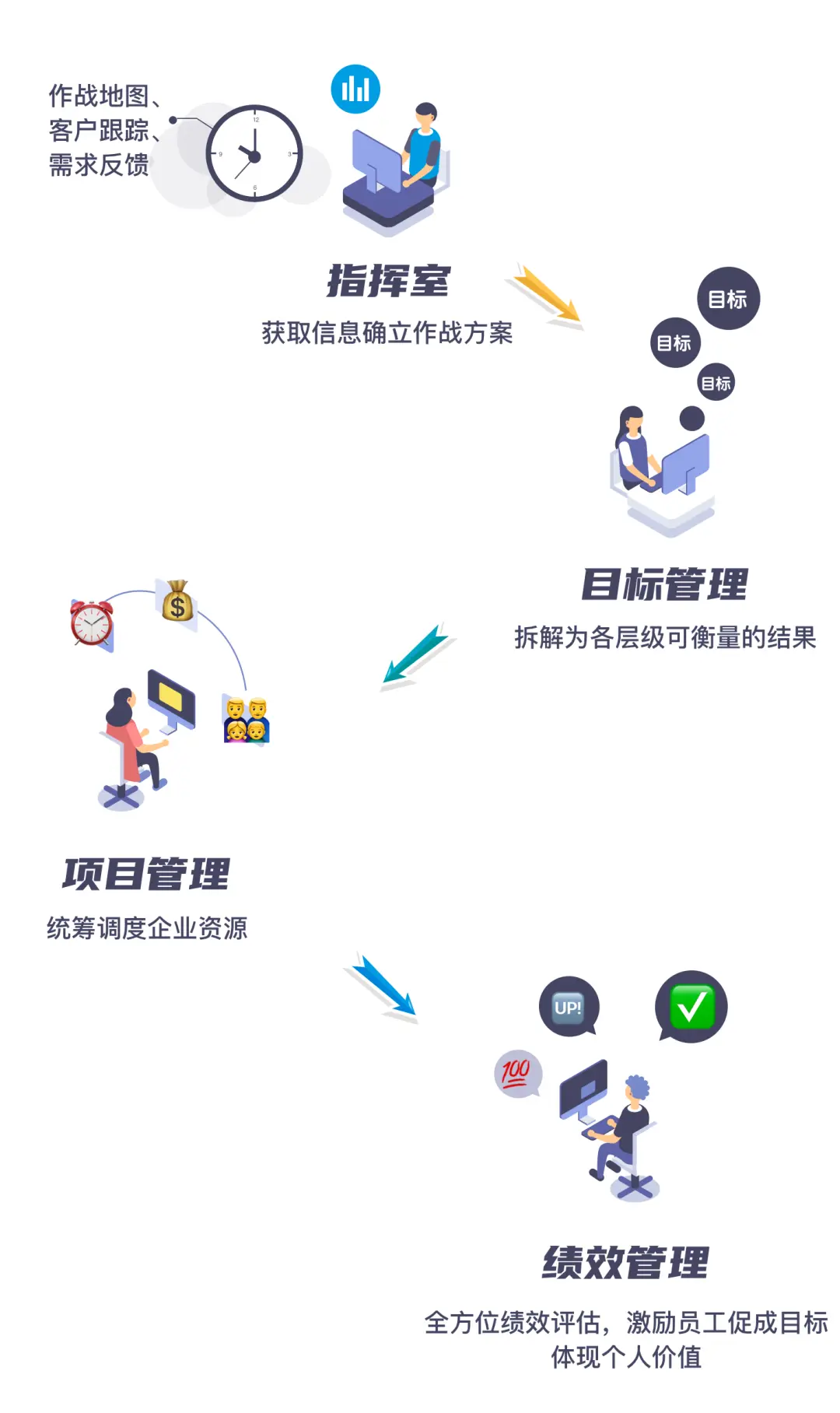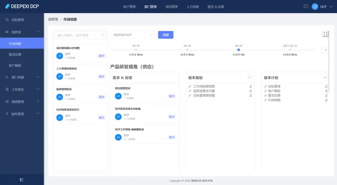 DEEPEXI® DCP的使用贯穿从客户需求到目标实现全过程。其中最为突出的指挥室、目标管理、项目管理和绩效管理的场景。