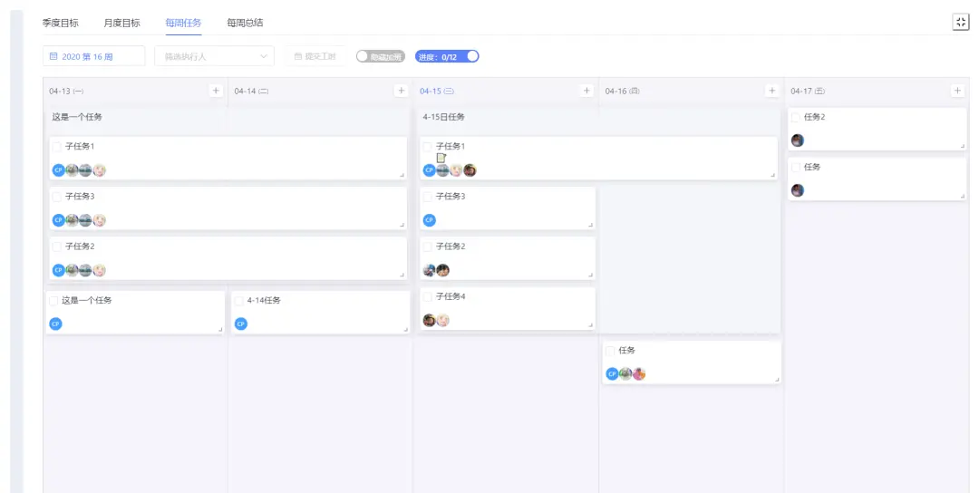 集团队目标、任务于一体化的管理平台,涵盖季度目标、月度目标、每周任务与每周总结等功能,可将战略目标分解到各层级可衡量的结果,并由各最小作战单元执行;看板界面清晰直观,可实时跟进目标进展,进行任务分配以及了解成员作战现状,增强互动,让整个协作过程更轻松、高效、流畅。