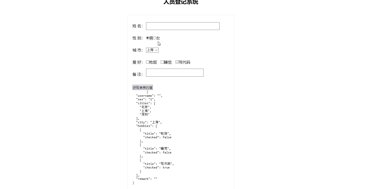 对于性别单选和爱好多选框,勾选时前台发生了什么变化,双向数据绑定了什么样的数据。