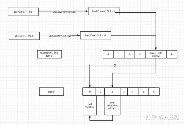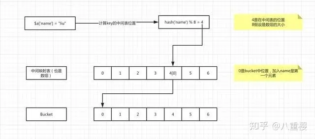先自己思考一下我们在获取数组的值 $a [‘name’], 是如何获取的,先用 key 计算 hash 值,拿到中间表的位置,再拿到 bucket 的位置,就能取到值了