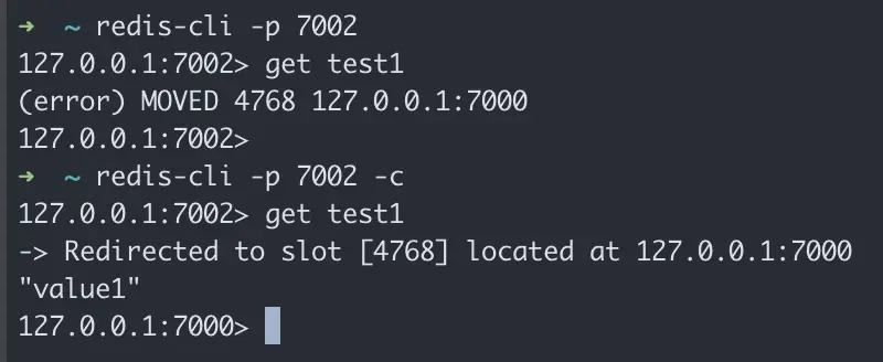 开始没加 -c 去请求一个不在本节点存储的 key ,会返回重定向信息,而如果加上,会自动进行重定向。
