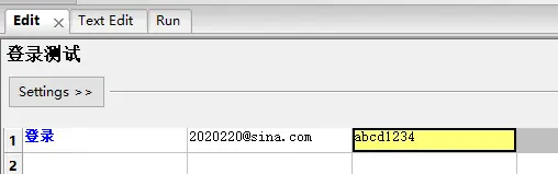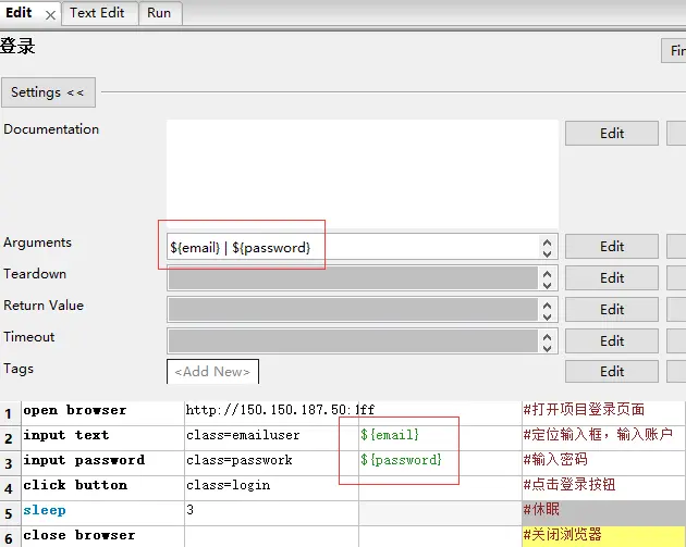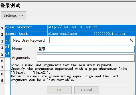 7.将用户账户和密码作为入参,变量用${}表示,在settings的Arguments设置,若是有多个参数,那么用|分隔,如${参数1}|${参数2}